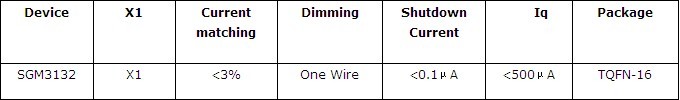 SGM3132作為圣邦微電子新近推出的低壓差單線調(diào)光模式白光LED燈驅(qū)動,相對市場上現(xiàn)有同類產(chǎn)品在性能上做了充分的改善,壓差降低到20mA電流條件下小于35mV,可以完美支持4顆LED在較低的電池電壓下(<3.5V)穩(wěn)定工作,工作電壓為2.5~5.0V, 通道間電流誤差小于3%,可以實現(xiàn)較高的通道亮度匹配度。支持單線脈沖調(diào)光,脈沖寬度支持最低1μS,啟動時間小于30μS,關(guān)斷模式下,靜態(tài)電流小于0.1μA,可以充分滿足各種便攜產(chǎn)品的應(yīng)用。