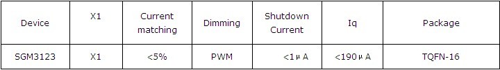 SGM3123作為圣邦微電子新近推出的低壓差模式白光LED燈驅(qū)動(dòng),相對(duì)市場(chǎng)上現(xiàn)有同類產(chǎn)品在性能上做了充分的改善,壓差降低到30mA電流條件下小于90mV,可以完美支持4顆LED在較低的電池電壓下(<3.5V)穩(wěn)定工作,工作電壓為2.5~5.5V,通道間電流誤差小于5%,可以實(shí)現(xiàn)較高的通道亮度匹配度。支持PWM調(diào)光,建議頻率在200Hz~10kHz,啟動(dòng)時(shí)間小于10μS(PWM頻率200HZ),關(guān)斷模式下,靜態(tài)電流小于1μA,可以充分滿足各種便攜產(chǎn)品的應(yīng)用。